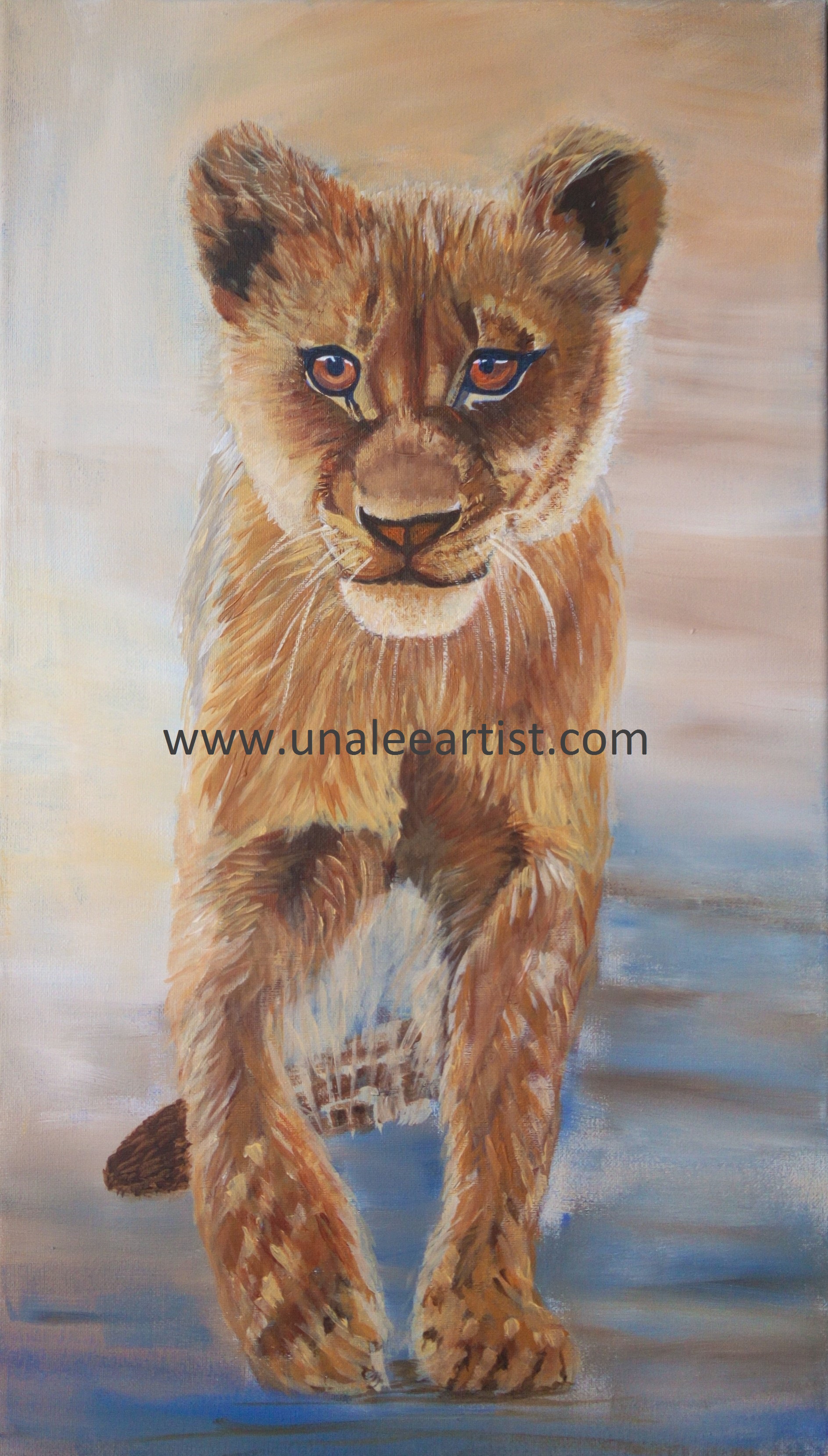 Previous Image Next Image Where’s mum’ lion cub watermark Acrylic painting. 1cm deep canvas board. Unframed. Size: 34cm x 60cm.
