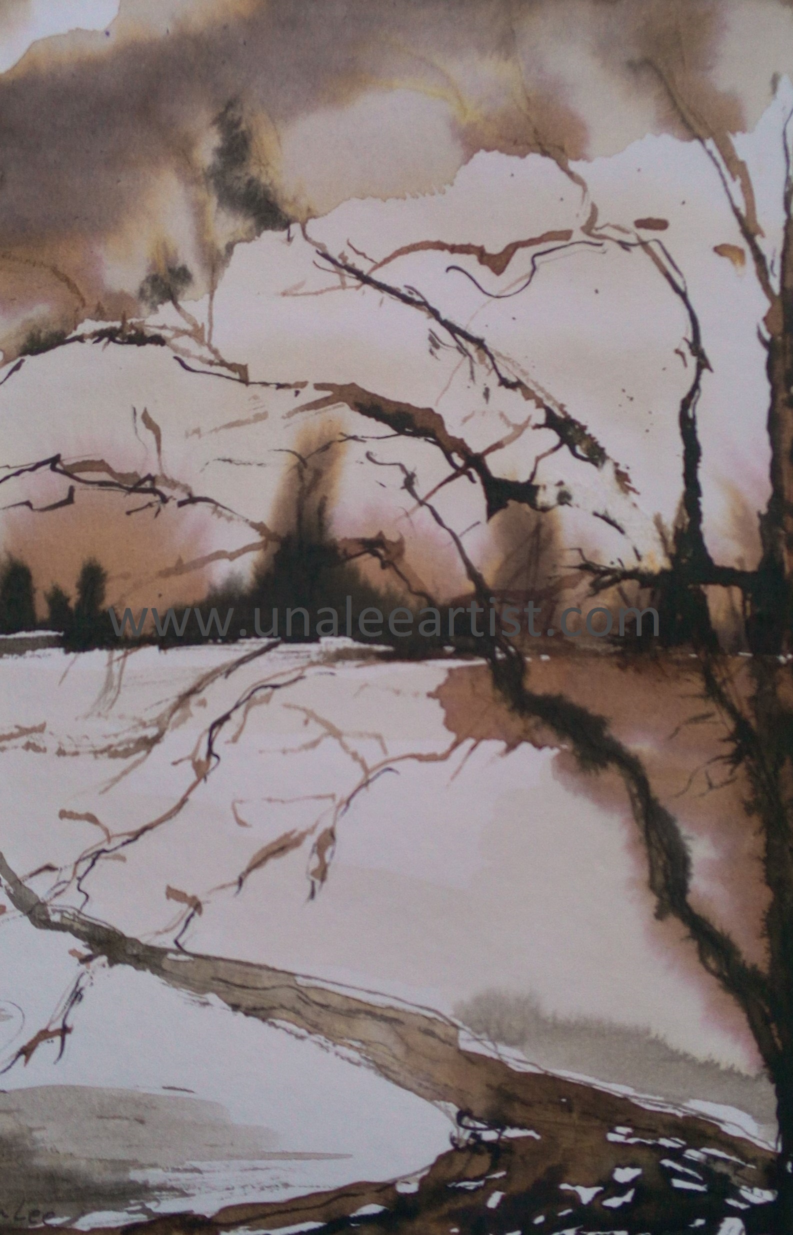 Previous Image Next Image winter snow on the Somerset Levels 2 watermark Ink. Framed. Size: 28cm x 34cm.